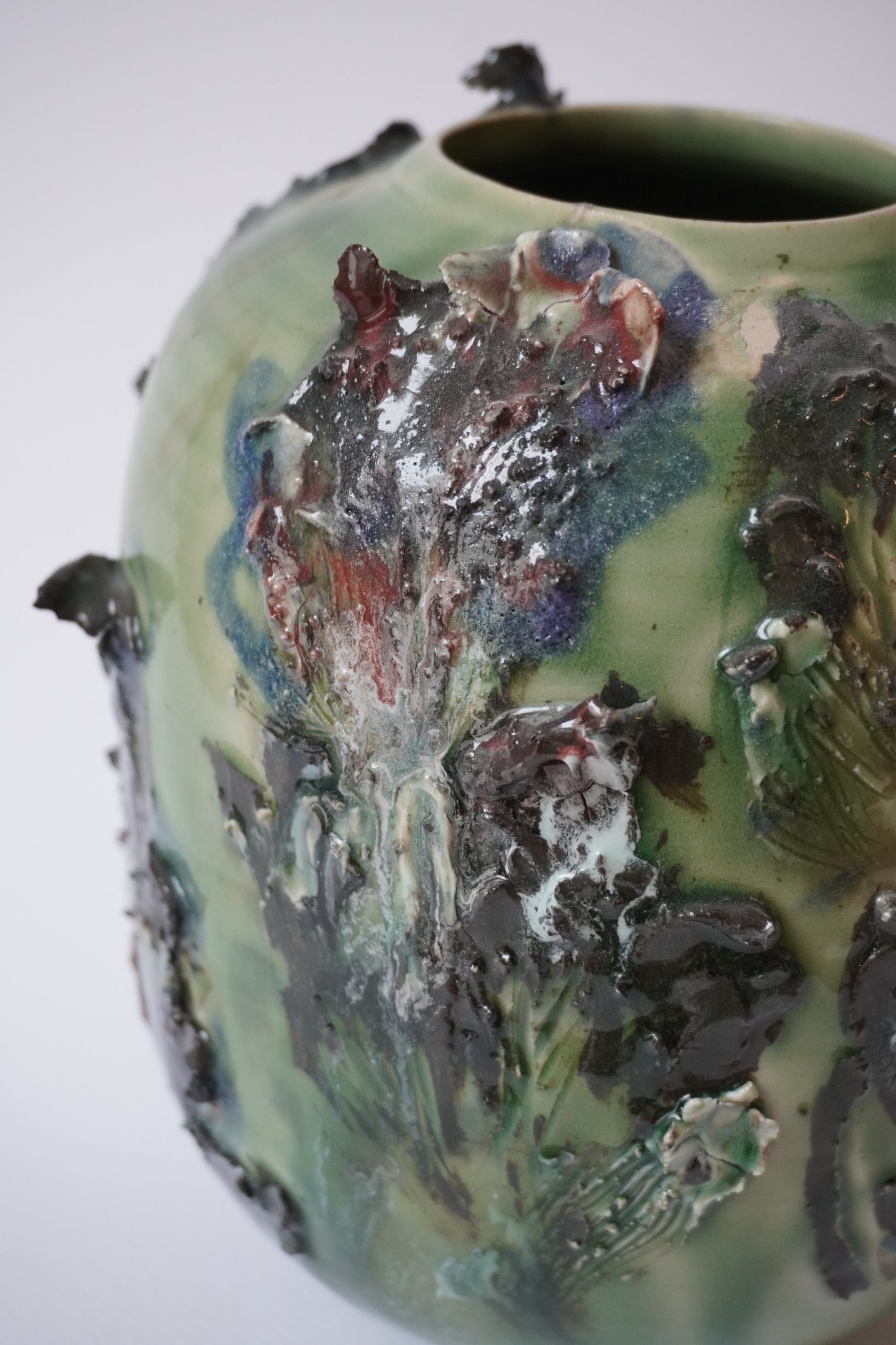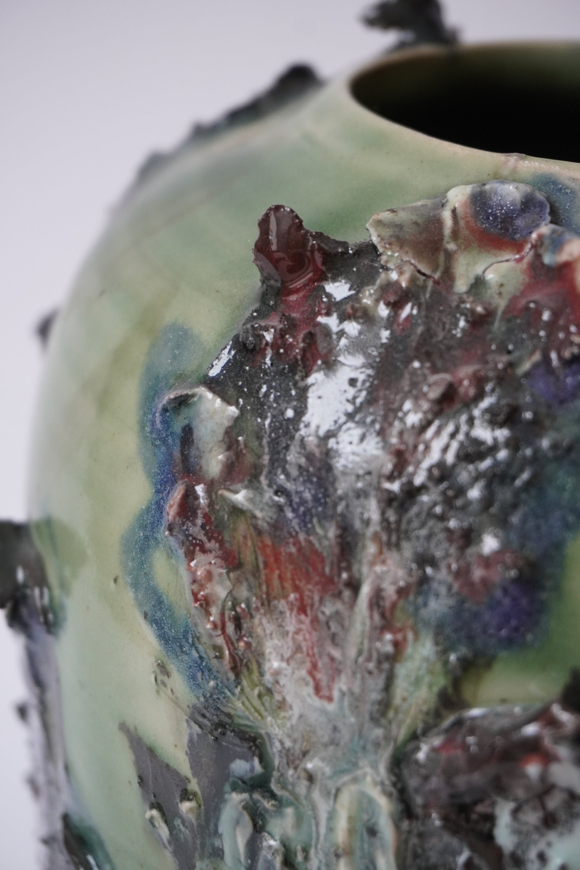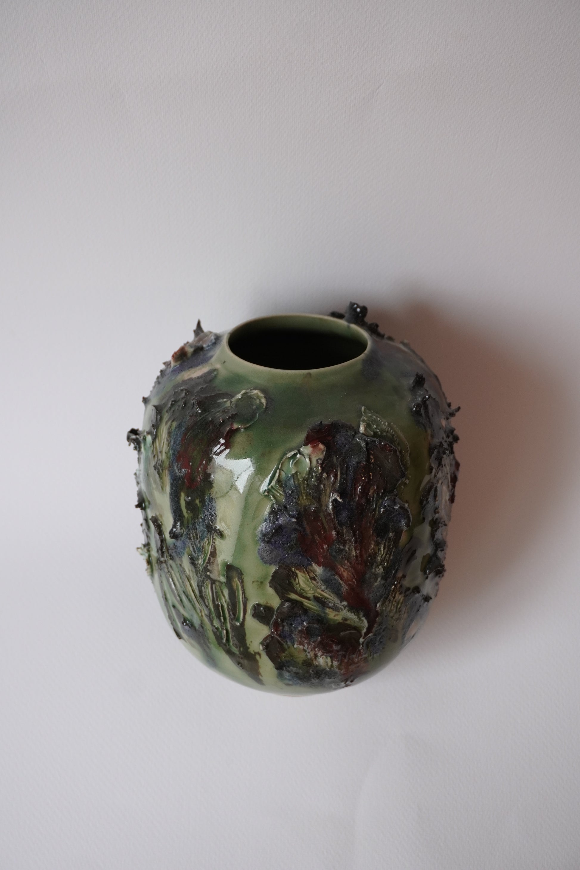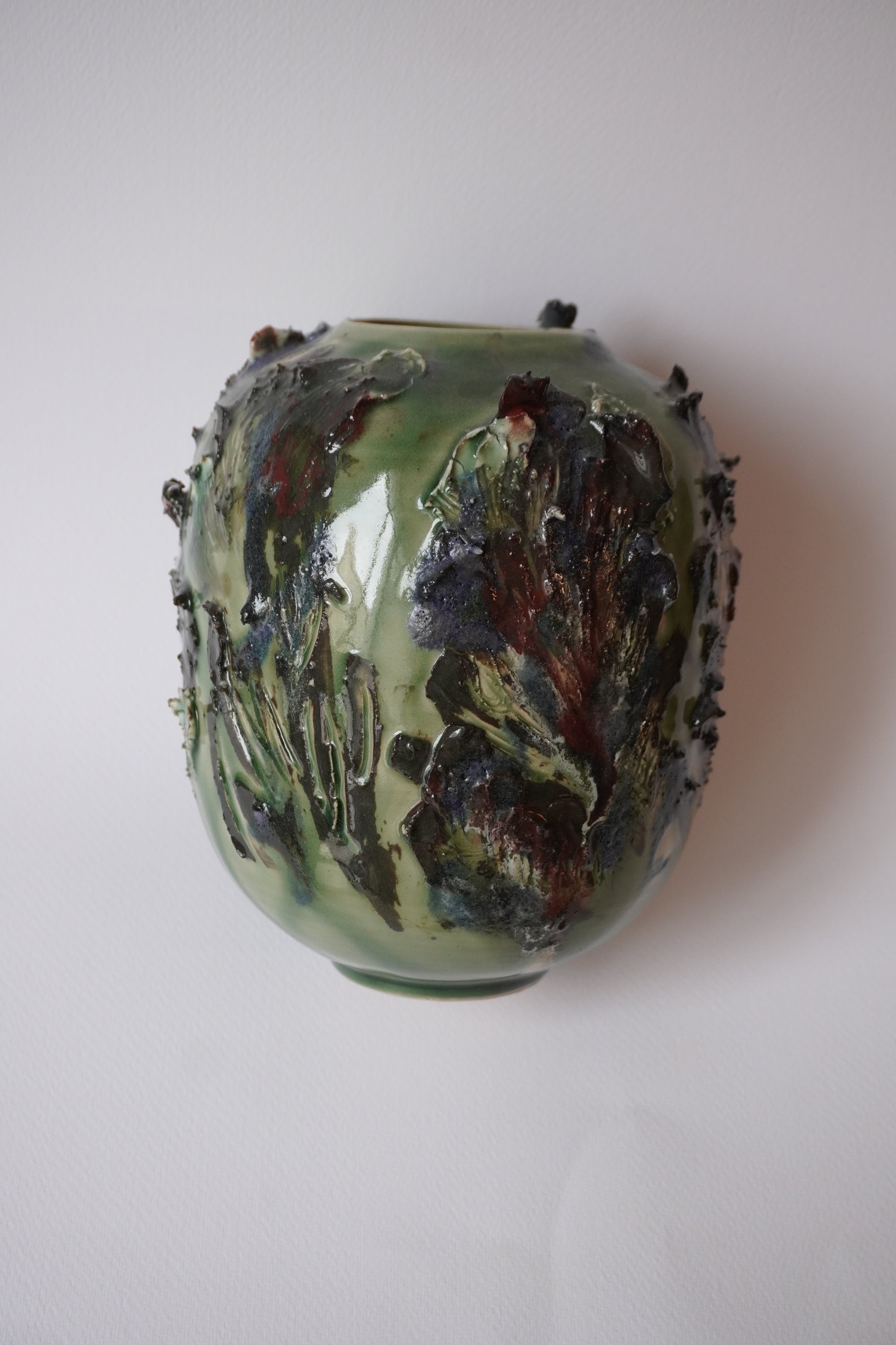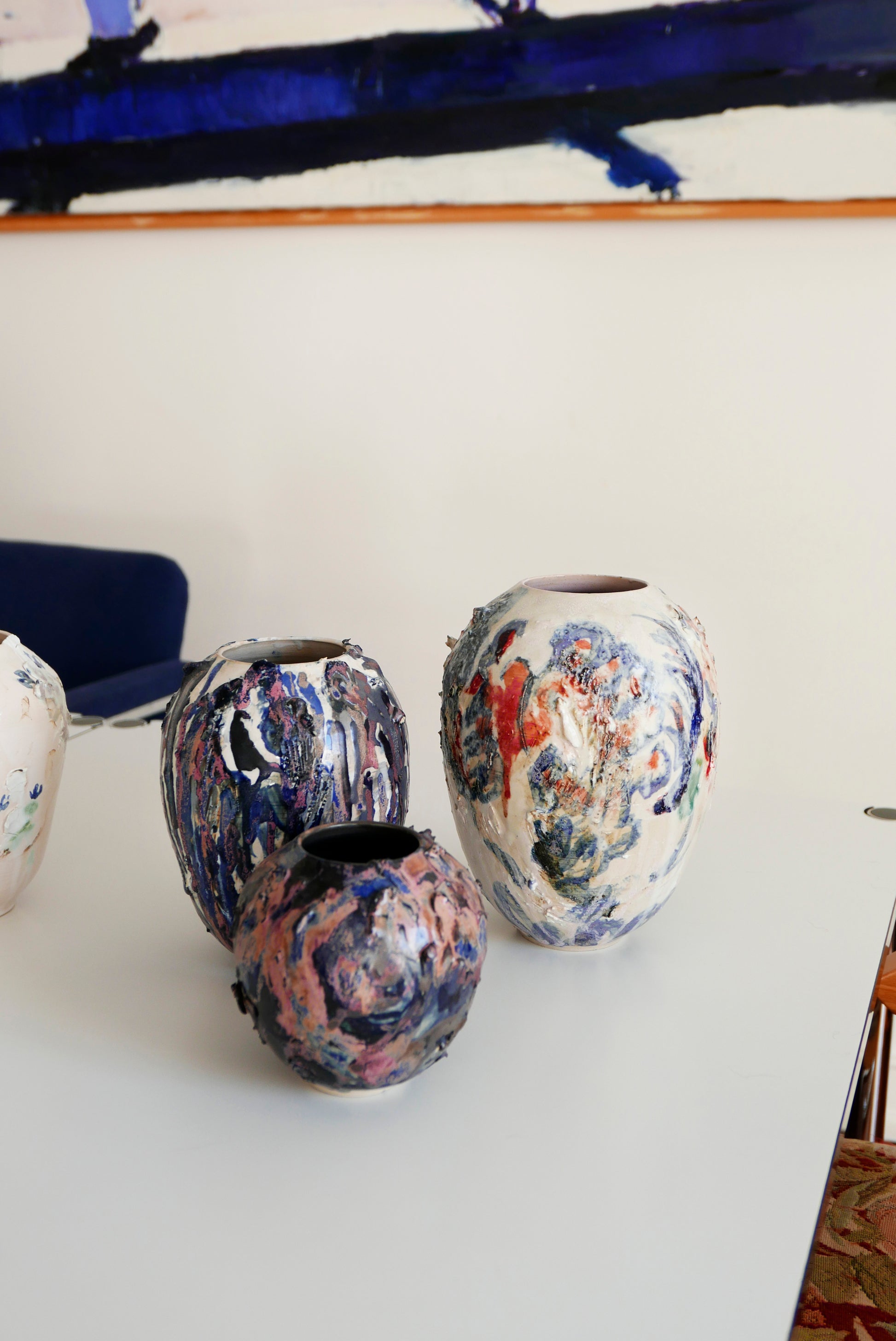 Made in stoneware and porcelain, Cypel’s work manifests as a series of wheel-thrown vessels and innovative lighting pieces that explore the intersection of time, matter, and memory. Her signature collection "Ovetti" features 3 sizes of ovoid forms with surfaces that range from porcelain pristine white to deeply textured landscapes in navy blues and earthy crusty textures that mimics earth's surface, each piece bearing witness to both geological formation and artistic intervention. The ovoid forms symbolise both birth and mortality, echoing both the egg and the urn. Yet, their circularity and absence of a lid make a statement about continuity—an infinite cycle where every ending is also a new beginning