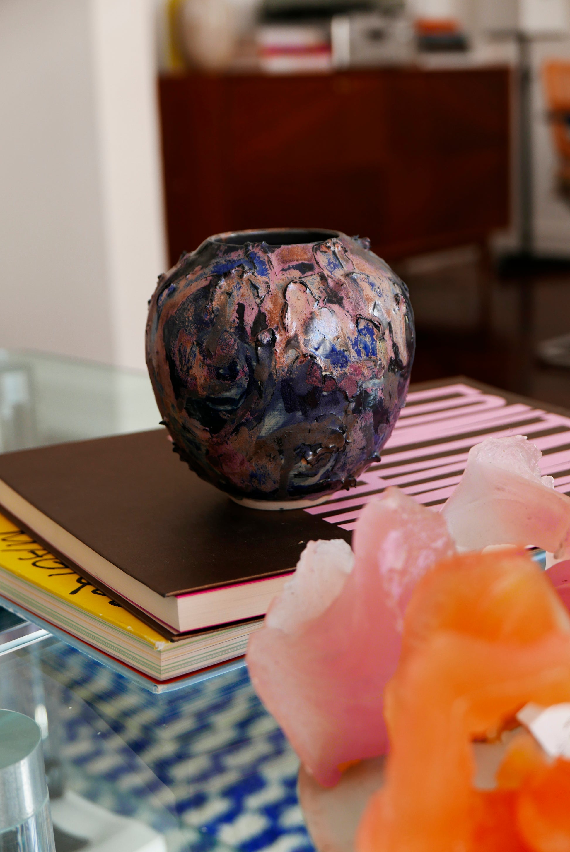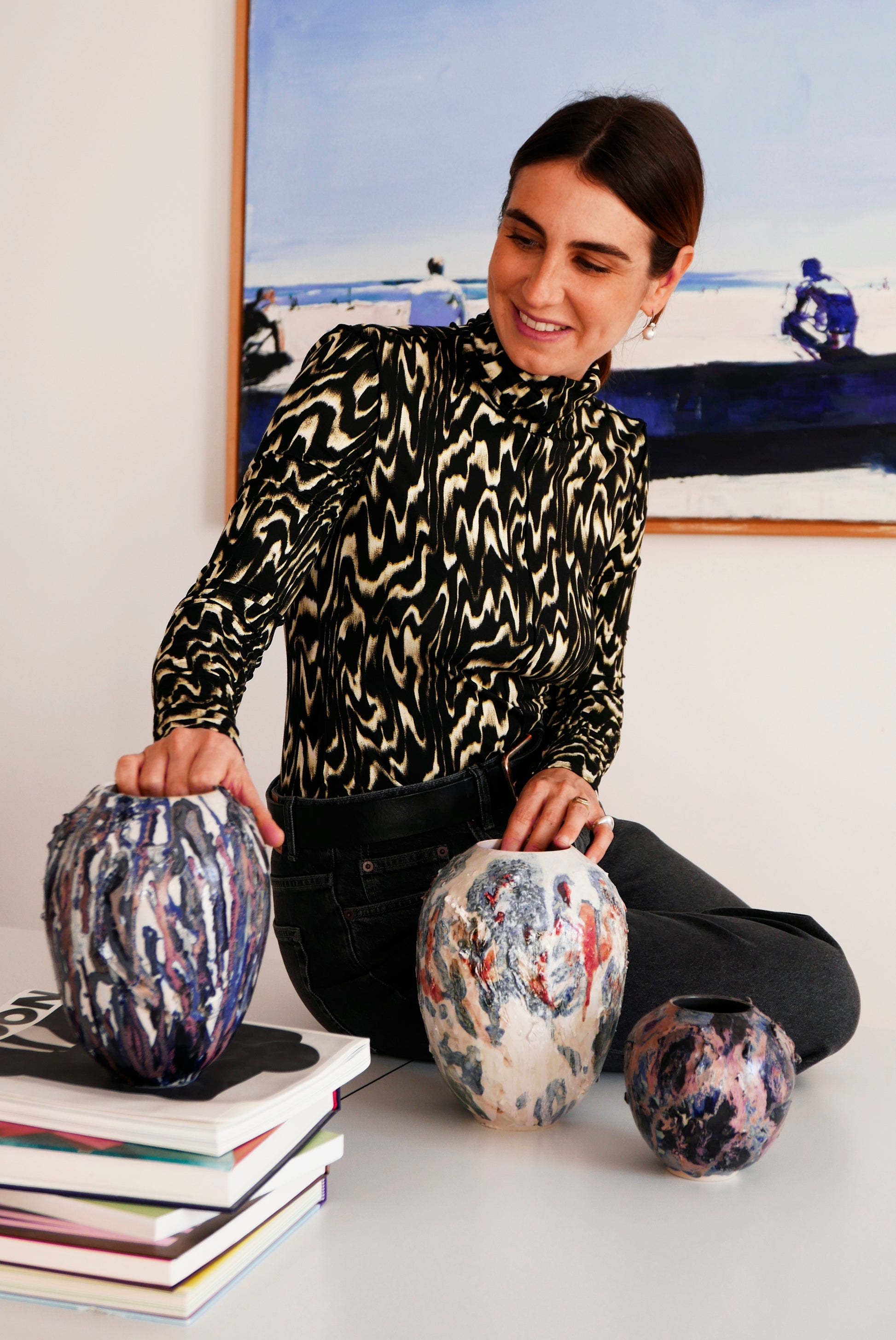Made in stoneware and porcelain Cypel’s work manifests as a series of wheel-thrown vessels and innovative lighting pieces that explore the intersection of time, matter, and memory. Her signature collection "Ovetti" features 3 sizes of ovoid forms with surfaces that range from porcelain pristine white to deeply textured landscapes in navy blues and earthy crusty textures that mimics earth's surface, each piece bearing witness to both geological formation and artistic intervention. The ovoid forms symbolise both birth and mortality, echoing both the egg and the urn. Yet, their circularity and absence of a lid make a statement about continuity—an infinite cycle where every ending is also a new beginning.